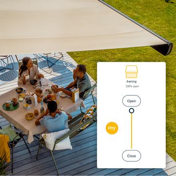 Khi mặt trời lặn và trời nóng, mái hiên của bạn sẽ tự động mở ra để giữ cho ngôi nhà của bạn mát mẻ. Nếu có bão, hãy kiểm tra từ xa xem mái hiên đã đóng chưa và cuộn lại nếu cần. Vào cuối tuần mùa hè, hãy thiết lập một sân thượng bằng cách tạo khung cảnh bằng cách sử dụng giàn che hoặc mái hiên được kết nối, đèn và âm nhạc yêu thích của bạn.